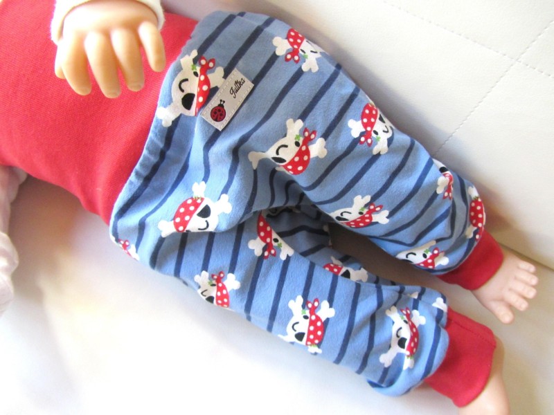 Pirat in blau mit weichem, extrahohem Bauchbund der doppelt umgeschlagen werden kann in rot. Fuß- und Bauchbündchen in rot.
