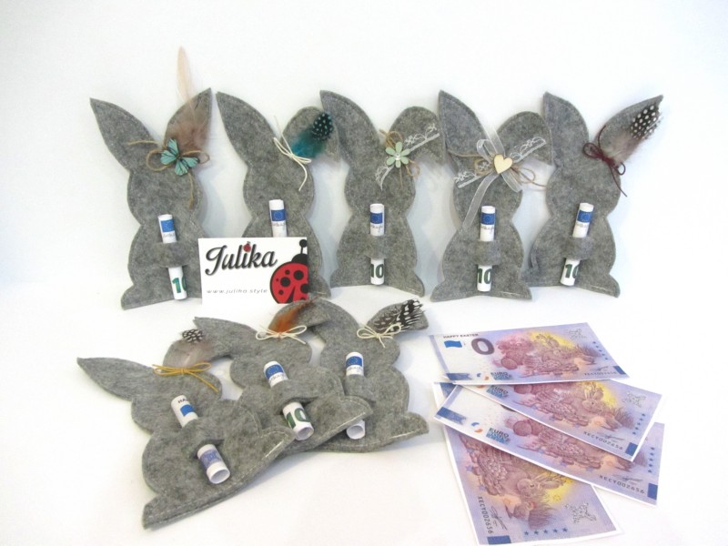 Kleiner, süßer Hase aus Filz genäht. Mit Schlitzen, um einen Geldschein rein zu geben.